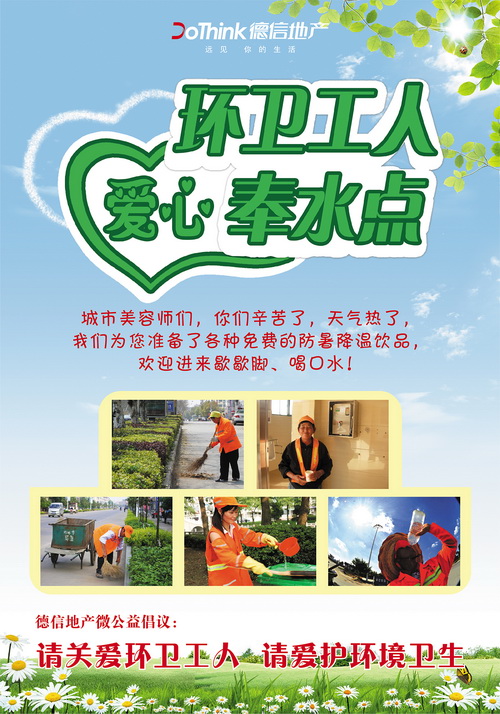 德信地产在此倡议:不乱扔垃圾;嚼过的口香糖,用纸巾包起再丢弃;拒绝车窗抛物;开车遇到他们,请减速慢行!体谅他们的工作,从我做起!