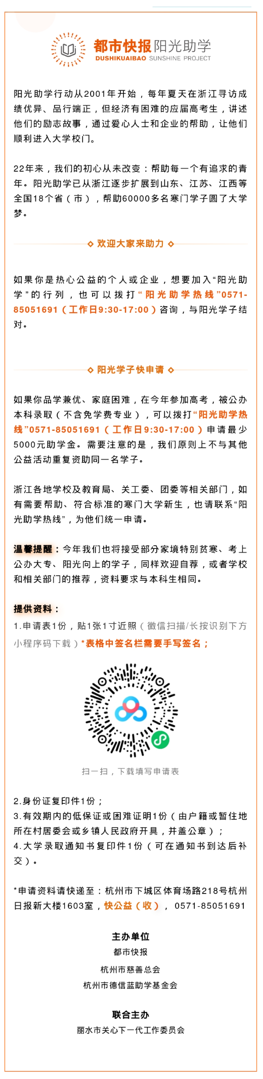 如果你也想帮助阳光学子圆大学梦,或者你身边有希望圆梦的寒门学子,都可以拨打都市快报“阳光助学热线”0571-85051691(工作日9:30-17:00)咨询,谢谢你们对阳光学子的支持和鼓励。你也可以关注快公益微博、微信,获取更多助学信息。